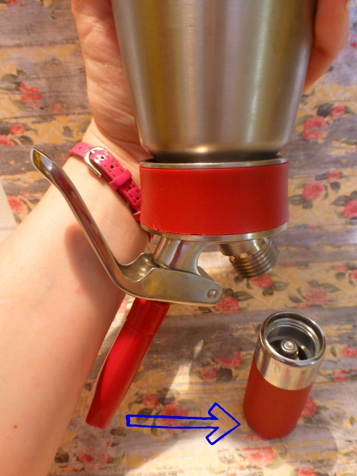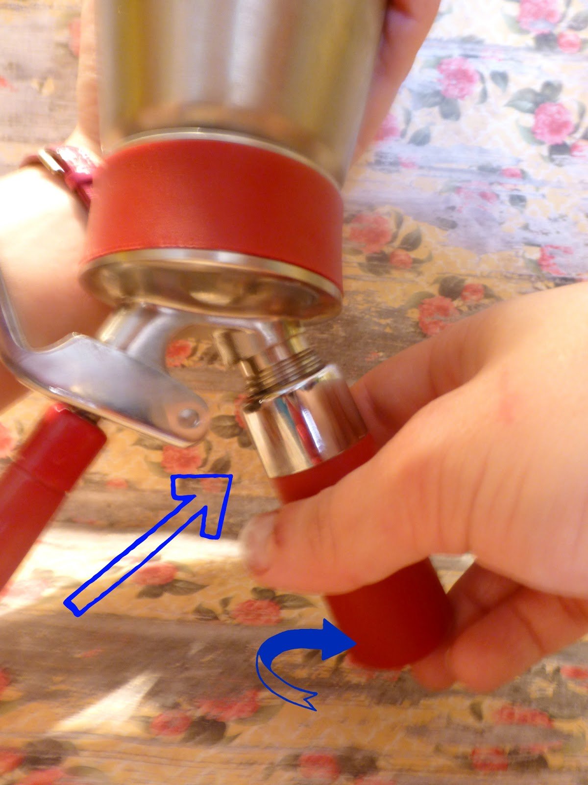 3-Aquí dentro va la carga de gas. Se desenrosca, se llena con la cápsula y se vuelve a enroscar para que suelte el gas dentro del sifón, oiremos un SHHHHH... cuando cese el ruido significará que el gas ya está dentro, y lo podemos desenroscar tranquilamente. (NUNCA dejar una carga dentro, se oxidan y se pueden quedar incrustadas).