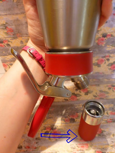 .Ya lo tenemos listo para usar: tiene el mismo mecanismo que esos tubos de nata que venden ya montada, lo ponemos boca abajo, apretamos la palanca que hay justo debajo de la boquilla y nos saldrá la espuma.