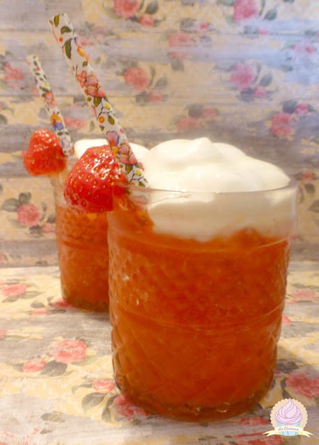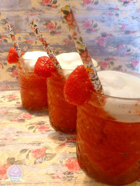 Cogemos los vasitos con el granizado y le ponemos espuma encima. Decoramos con una fresita.