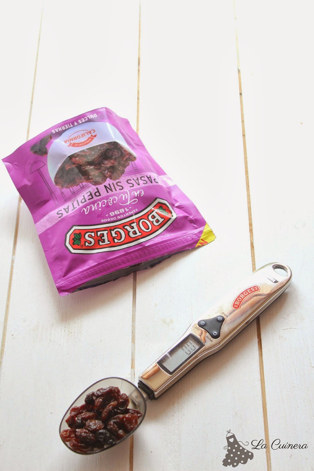 En él contenía un delantal con el nombre de mi página, una cuchara medidora, pistachos, pasas, almendras, nueces, cacahuetes y coco rallado.
