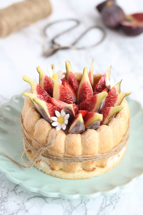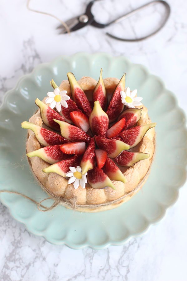 La charlotte es una tarta que se hace con los típicos bizcochos de Soletilla que aquí les llamamos, o yo les he llamado toda mi vida "melindros", va relleno de una bavaroise y decorada con fruta de temporada. Me habría encantado hacerla de fresas, pero la temporada ya está mas que terminada, así que la he hecho con higos que es básicamente lo que hay ahora, pero queda bien con cualquier fruta que veáis bonita, ya sean peras, melocotones, frambuesas, fresas, mango... así que esta receta la podéis adaptar a cualquier temporada, tan solo cambiando la fruta y adecuando el licor del almíbar a la fruta que hayáis escogido.