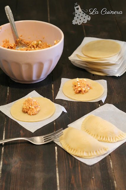 .Lo mezclamos todo, con una cuchara hacemos una bolita que pondremos en el centro de cada redondita de masa, la doblamos y la cerramos haciendo unas marcas con un tenedor.